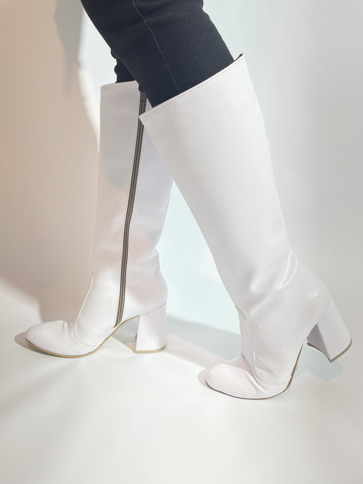 Botas caña alta confeccionada en cuero PU, taco cuadrado, y cierre lateral.