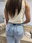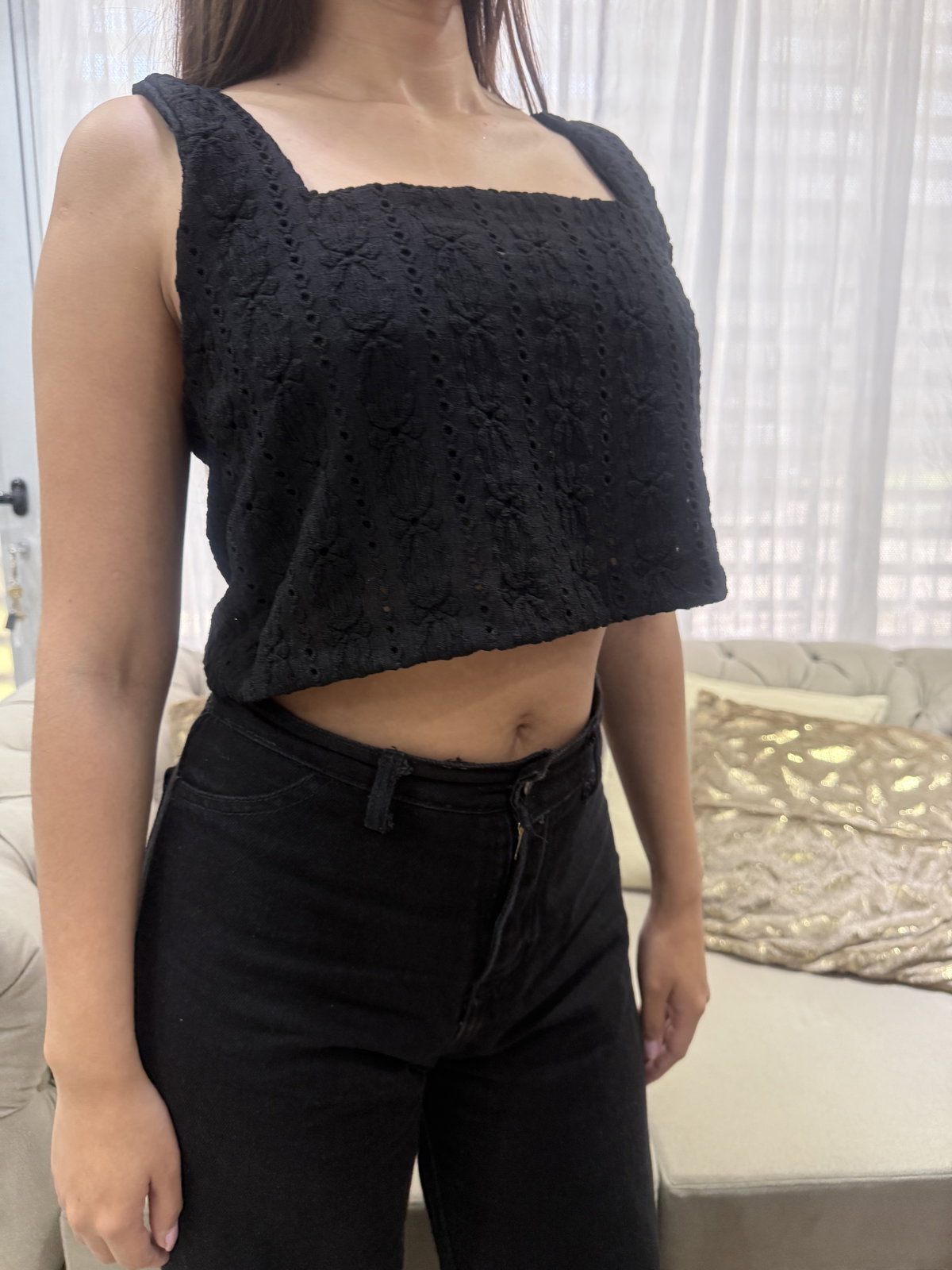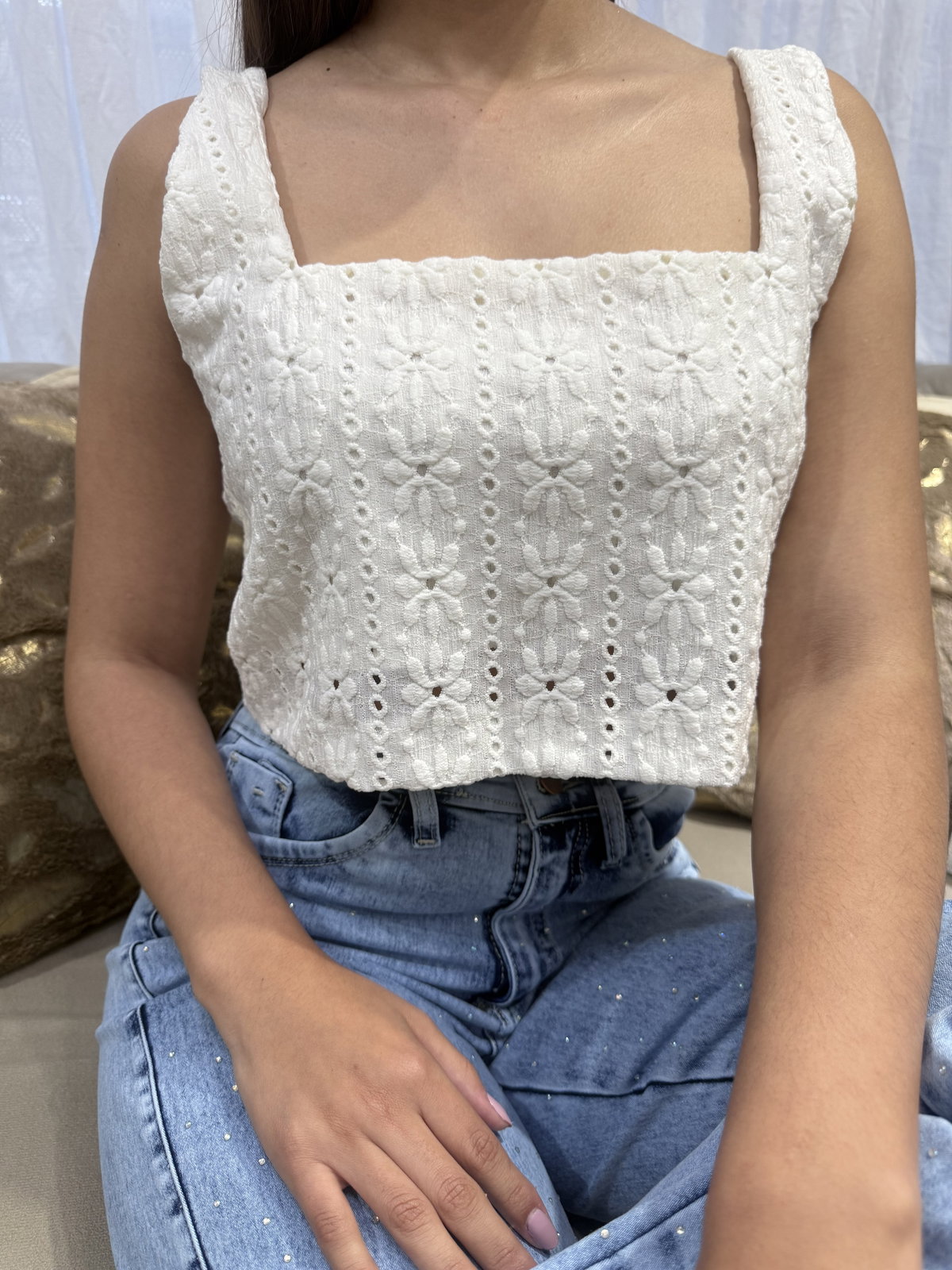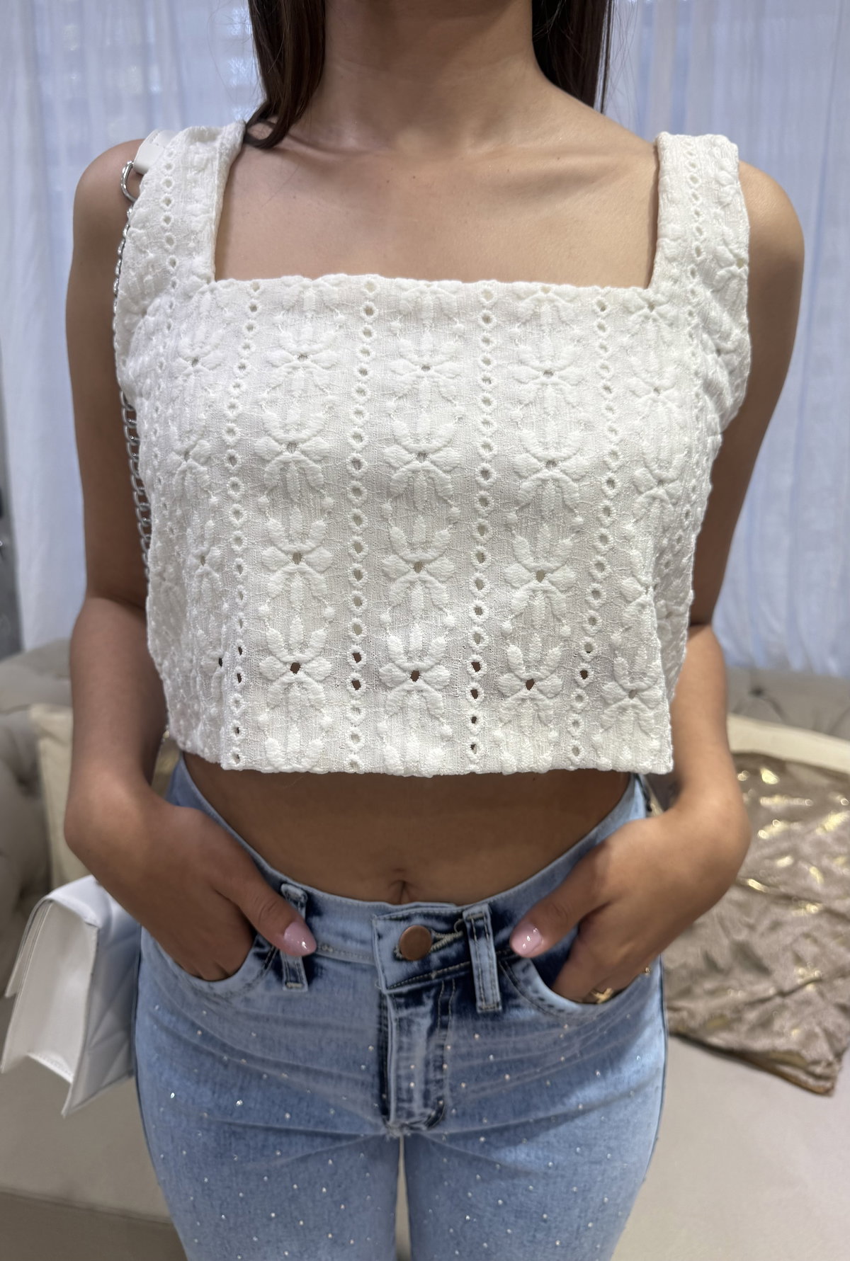 Top Broderi, escote cuadrado. En color blanco / negro. Talle único.