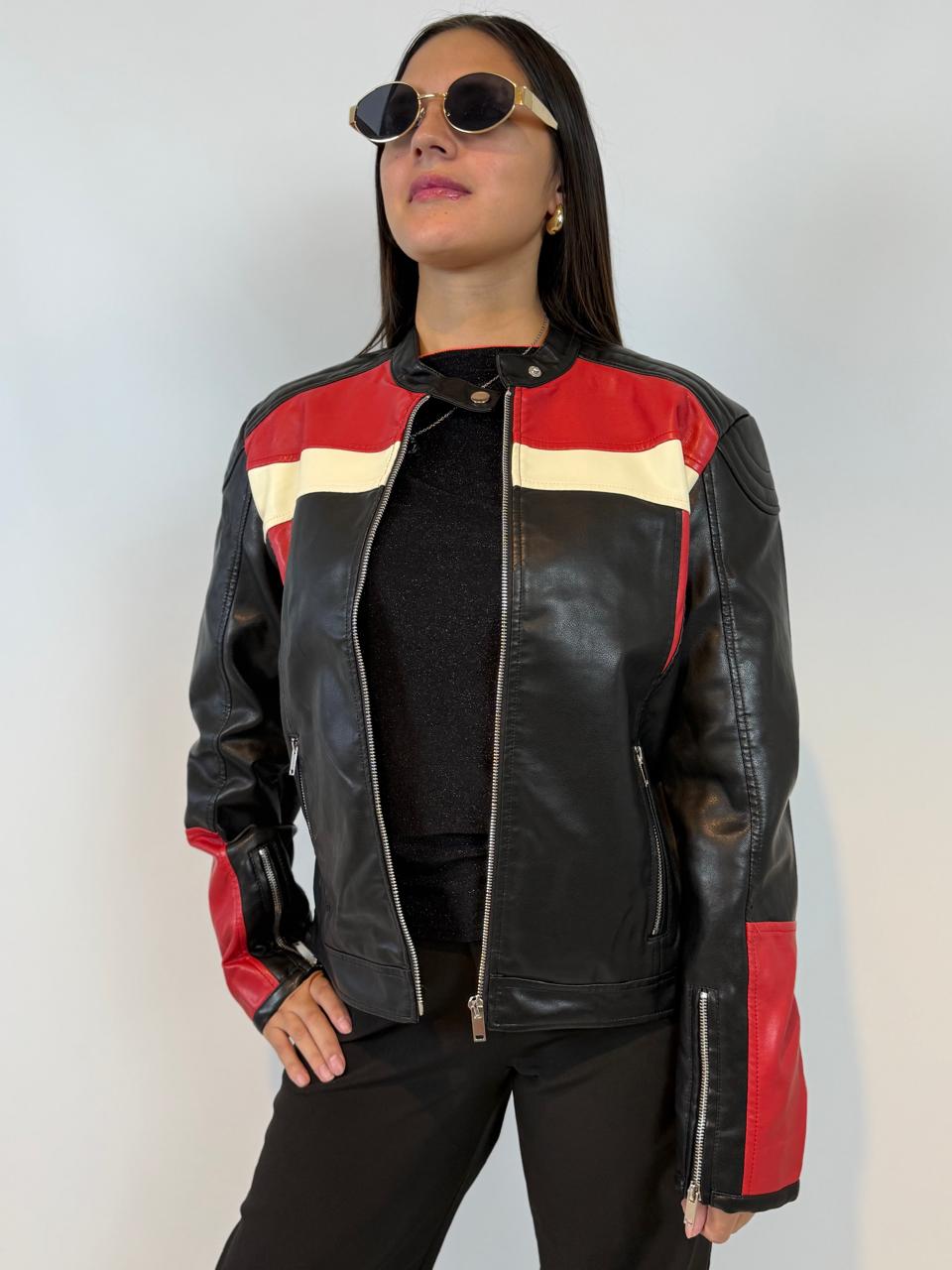 Campera eco cuero combinada , color rojo/negro. Atemporal.