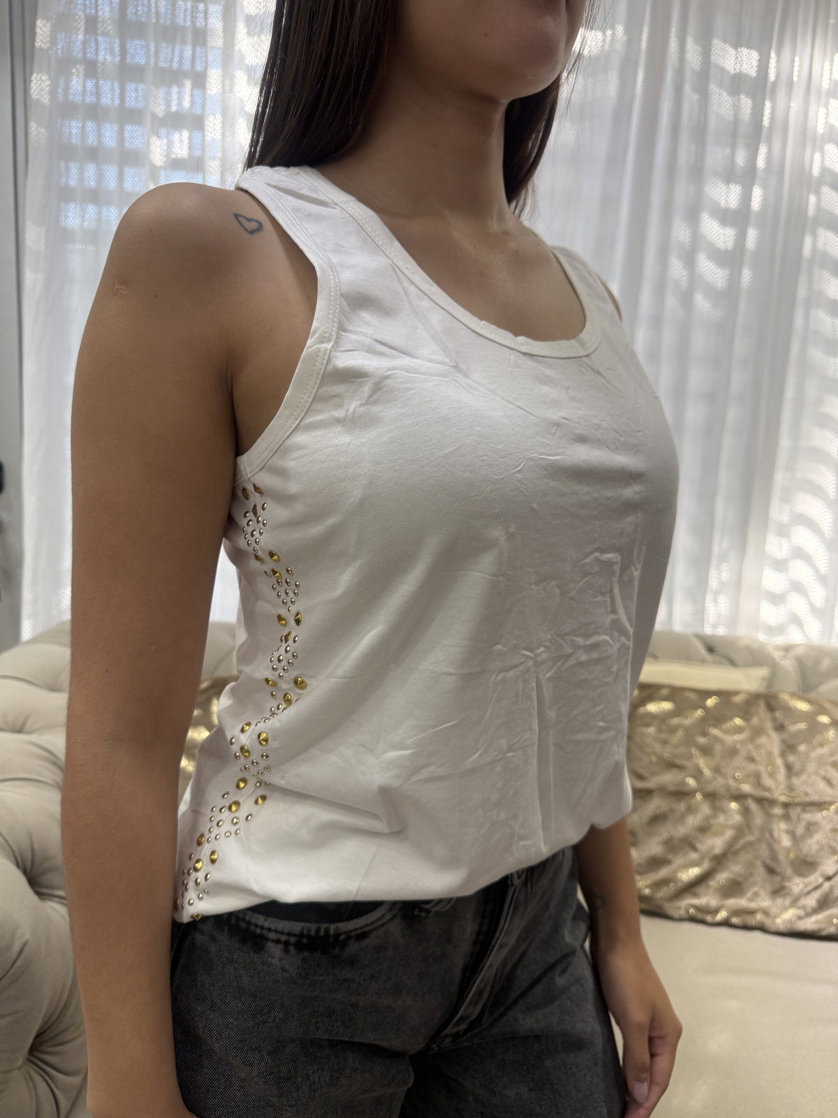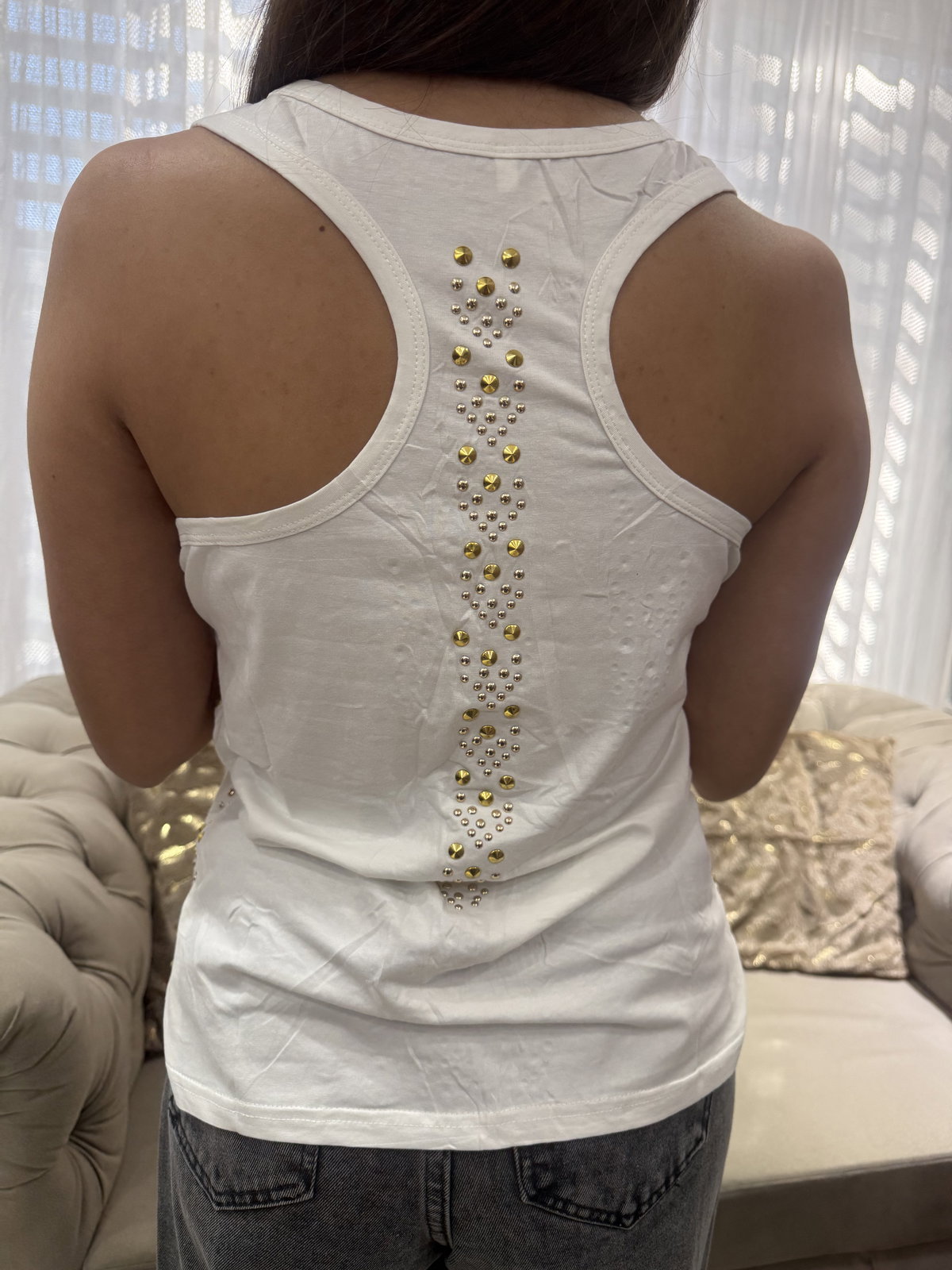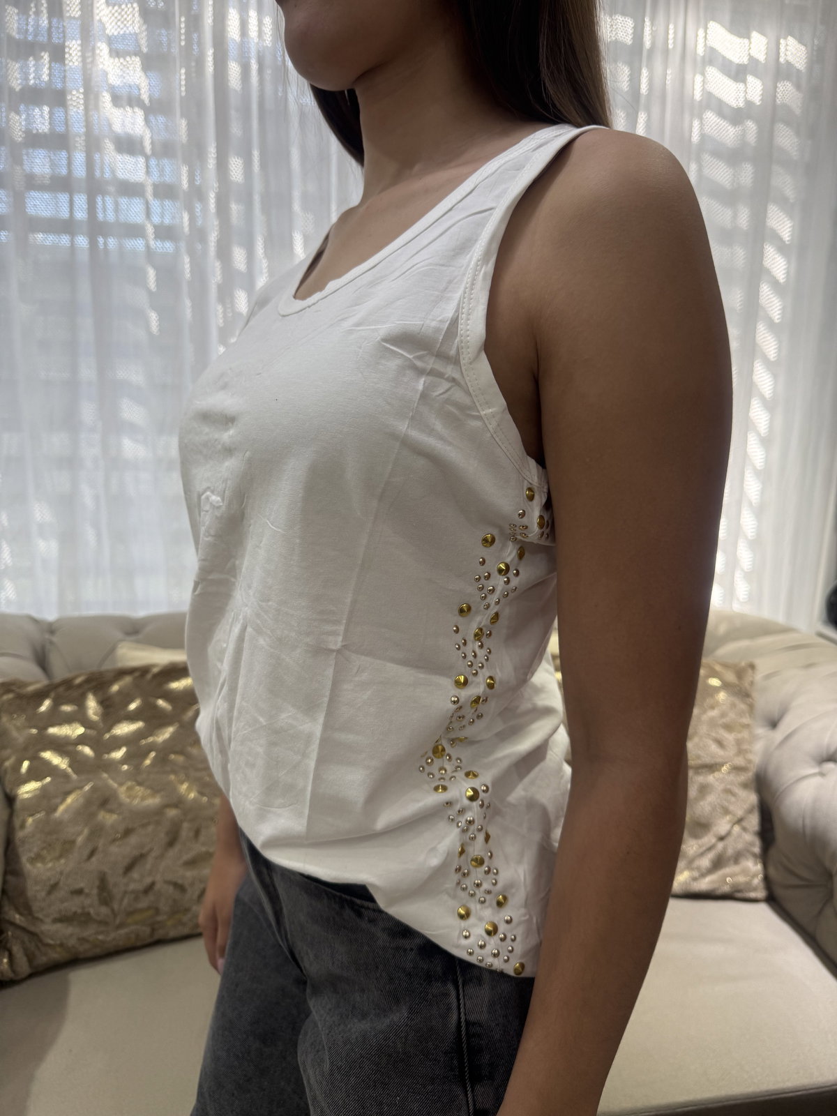 Musculosa blanca con tachas doradas en los laterales y detrás.