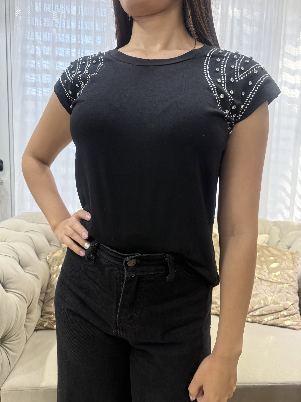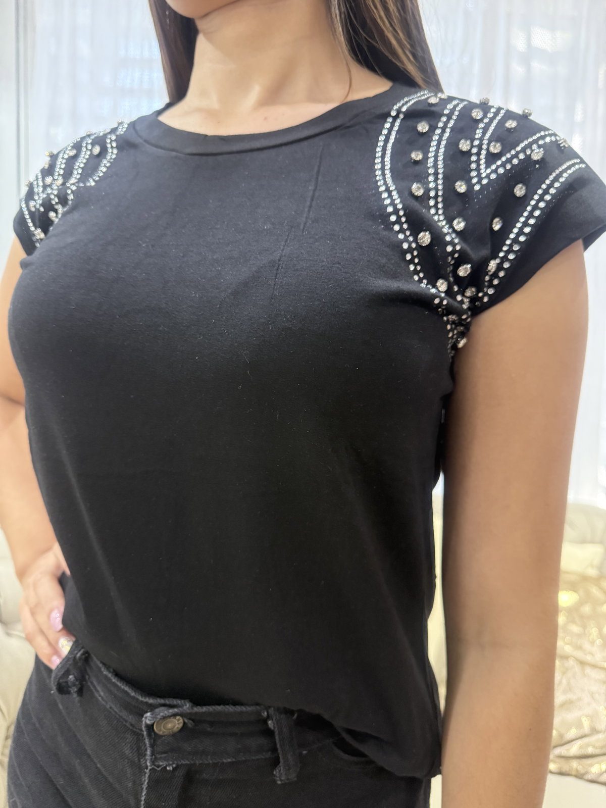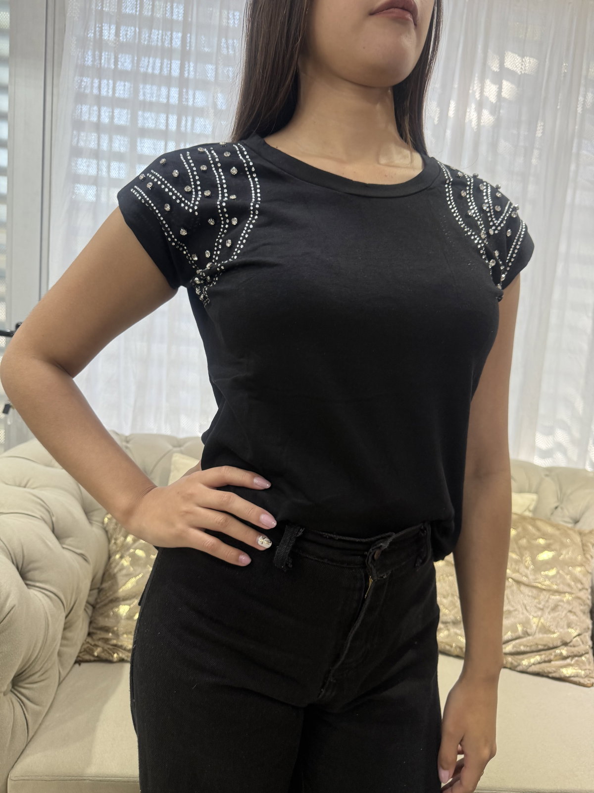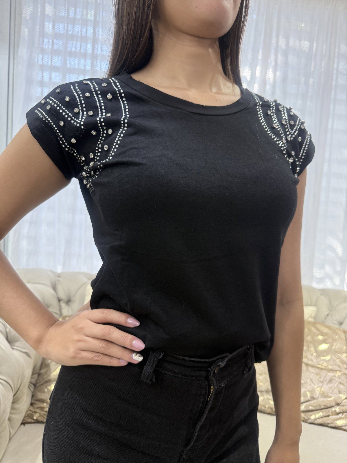 Remera con hombreras, Strass y piedras brillantes en hombros.
