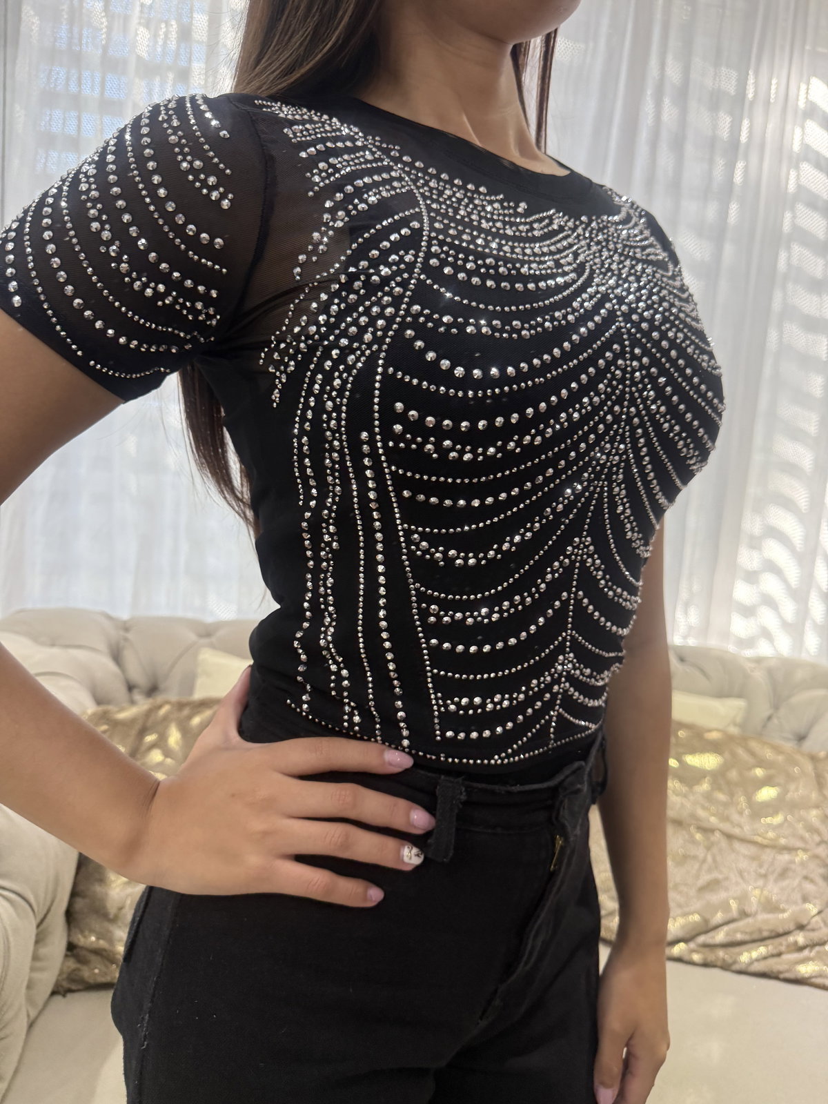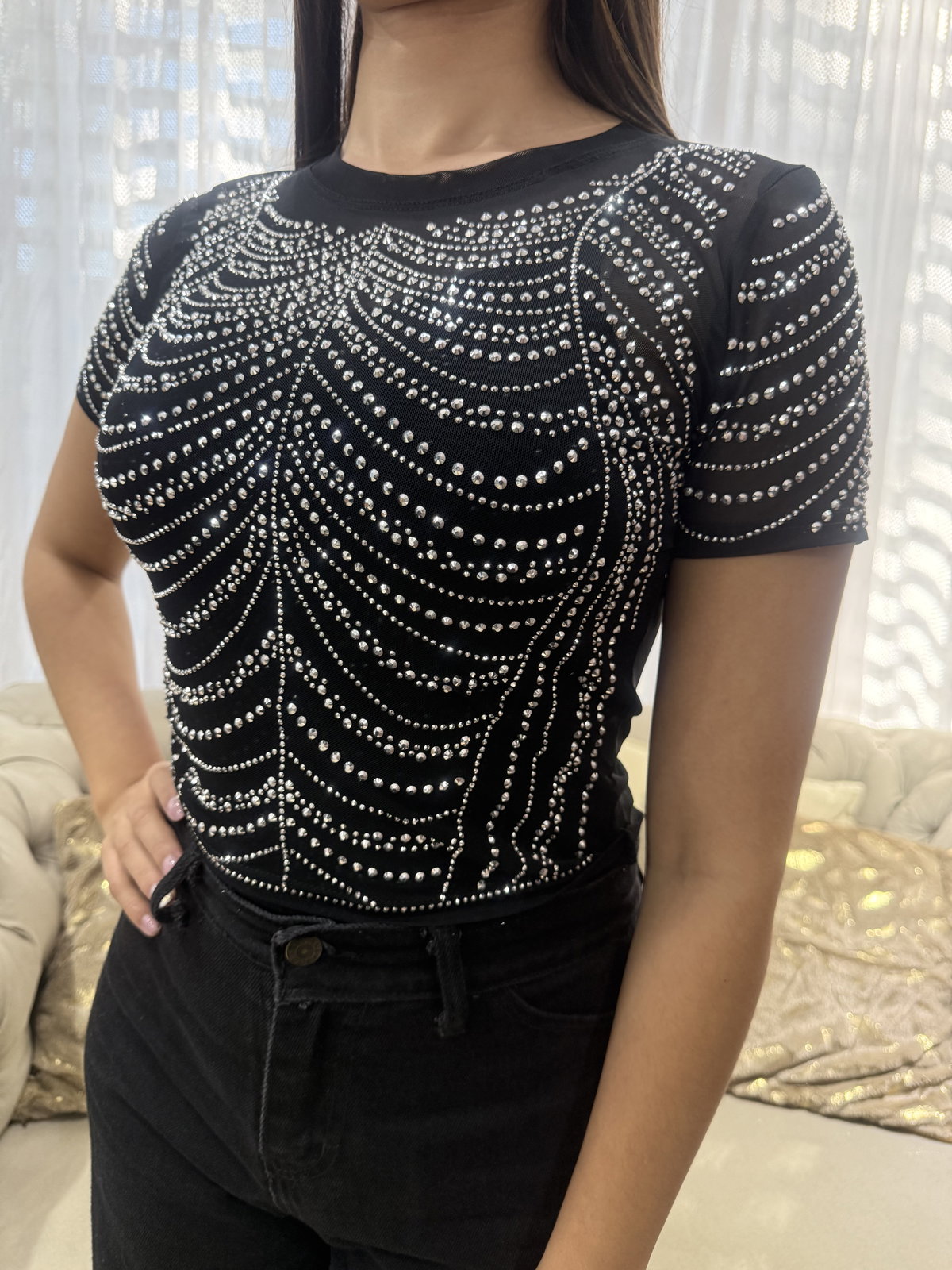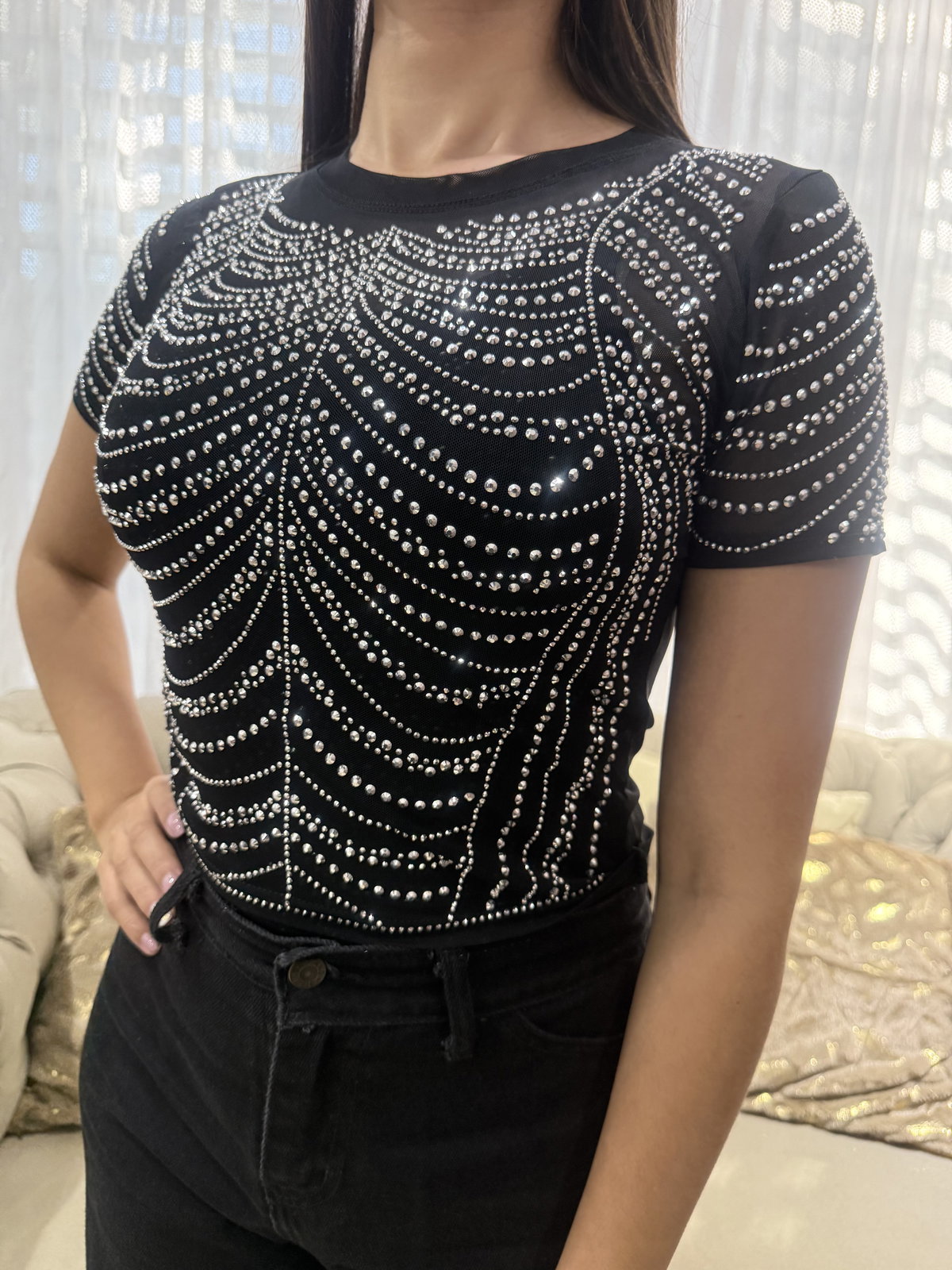 Top tul, con strass, color negro, talle único. Abarca un S/M.