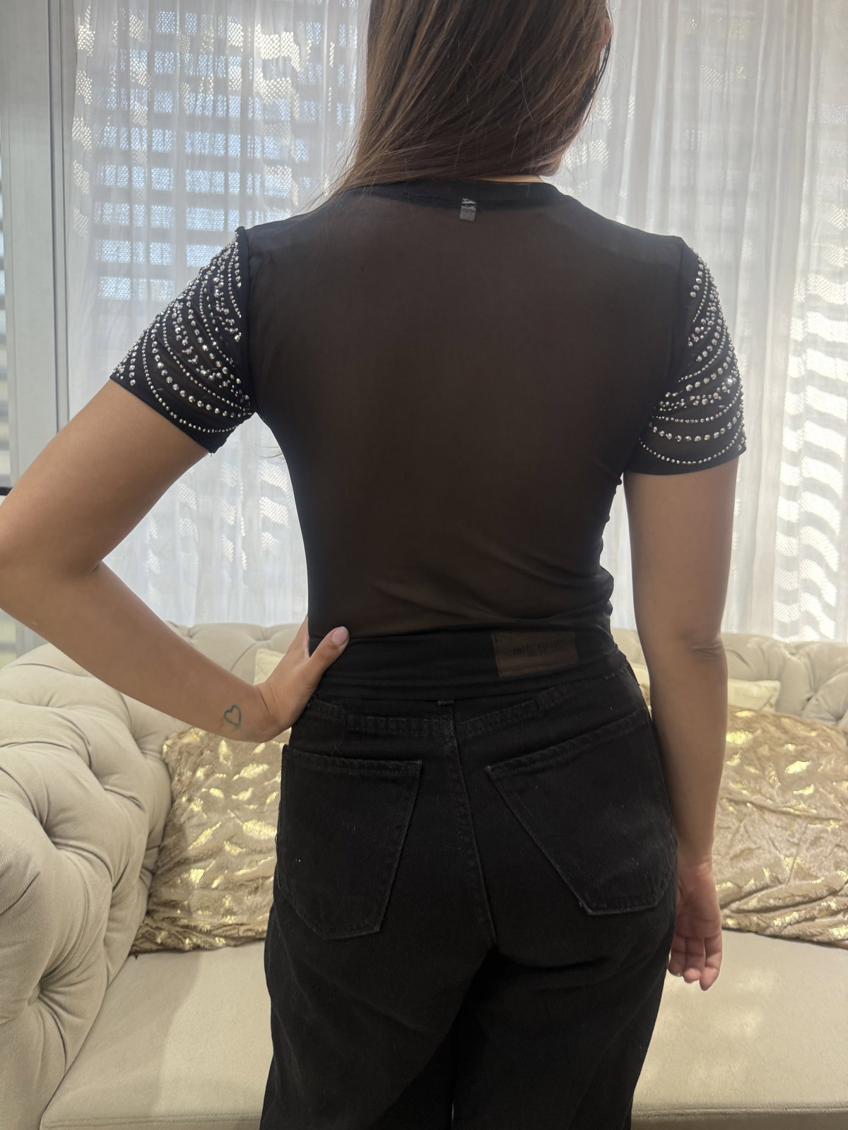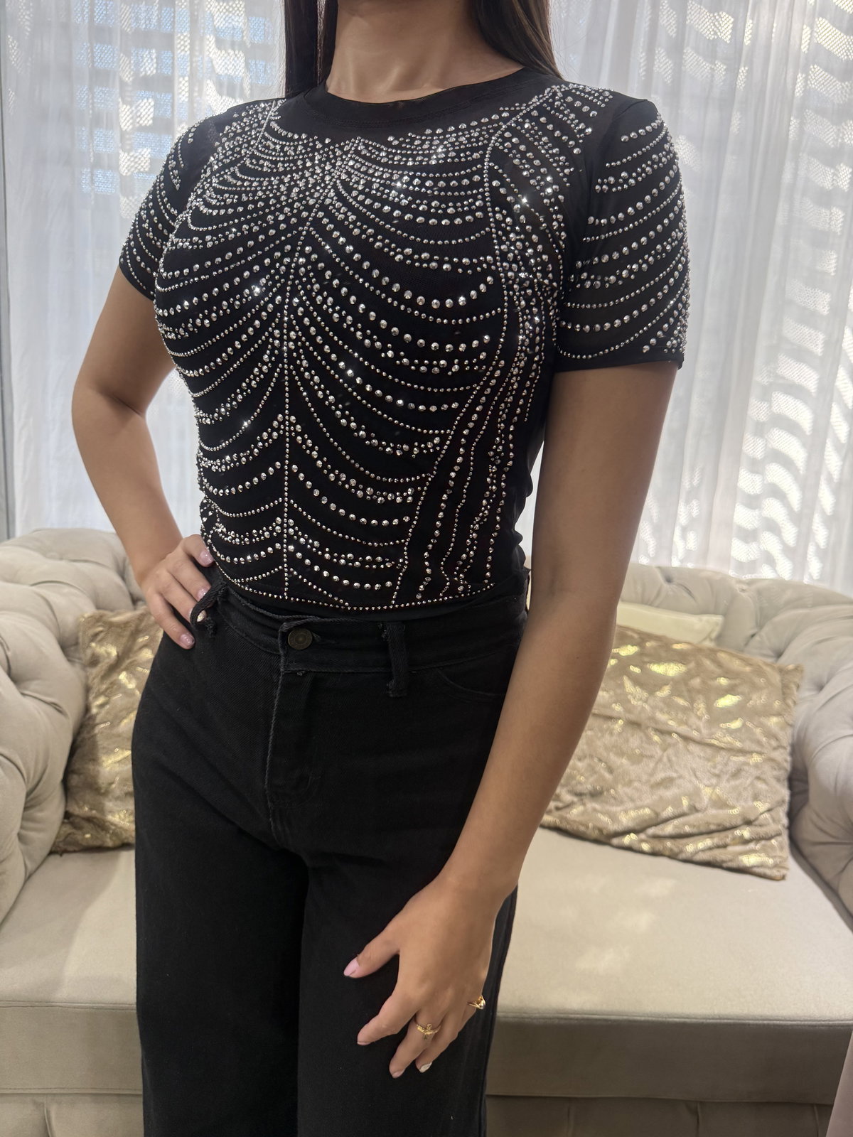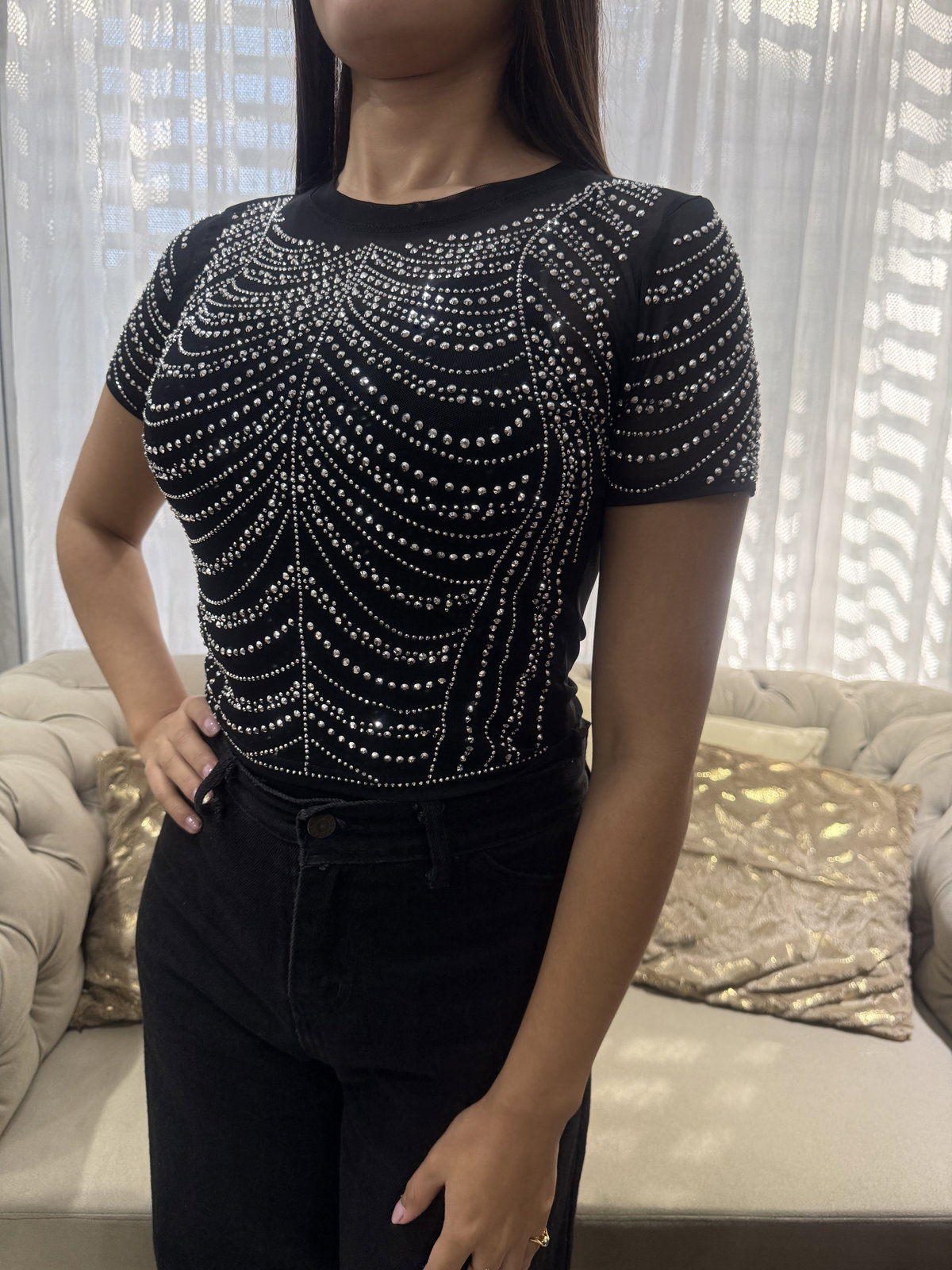Top tul, con strass, color negro, talle único. Abarca un S/M.
