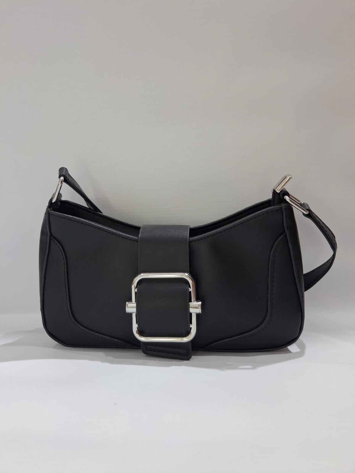 Cartera mini bags negra con hebilla en el medio, color plateada.