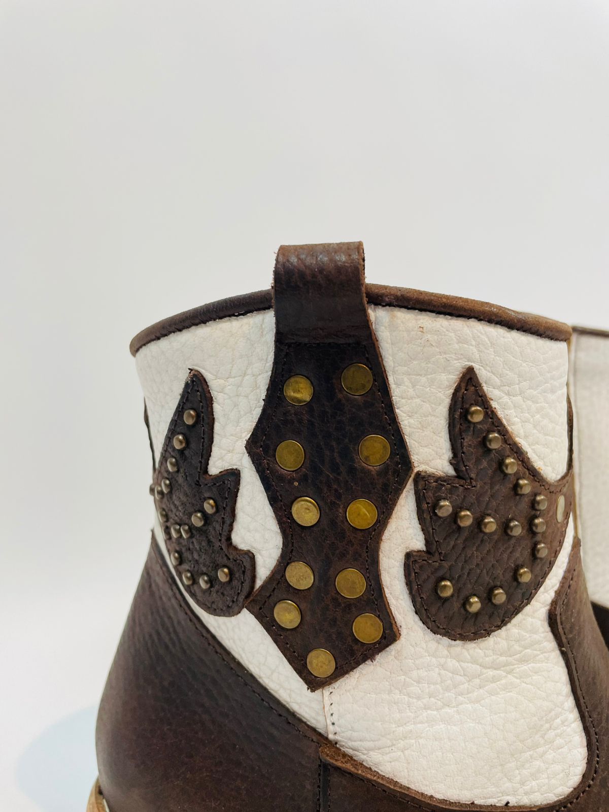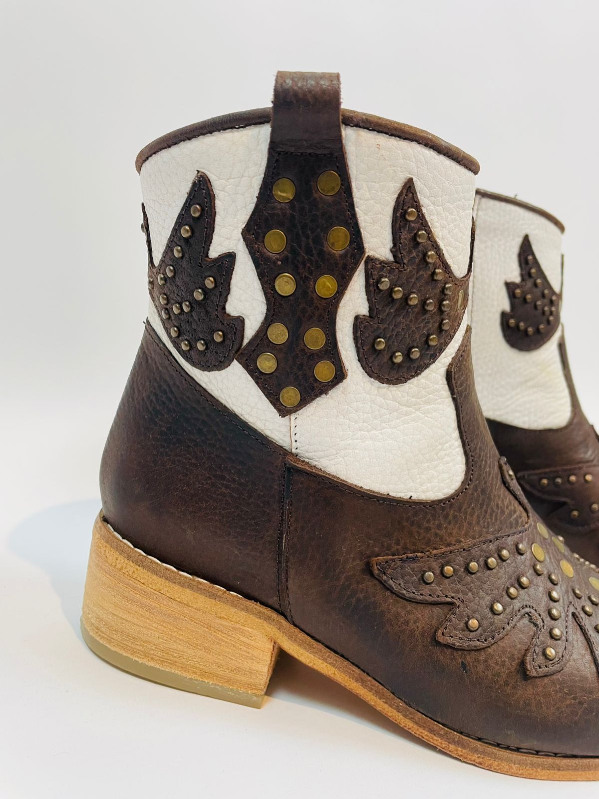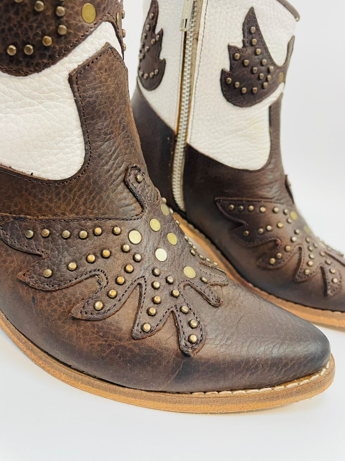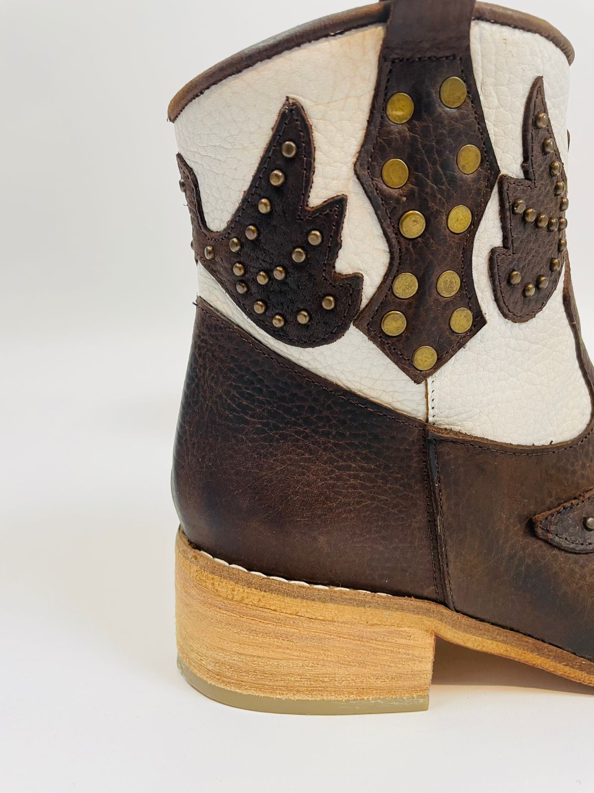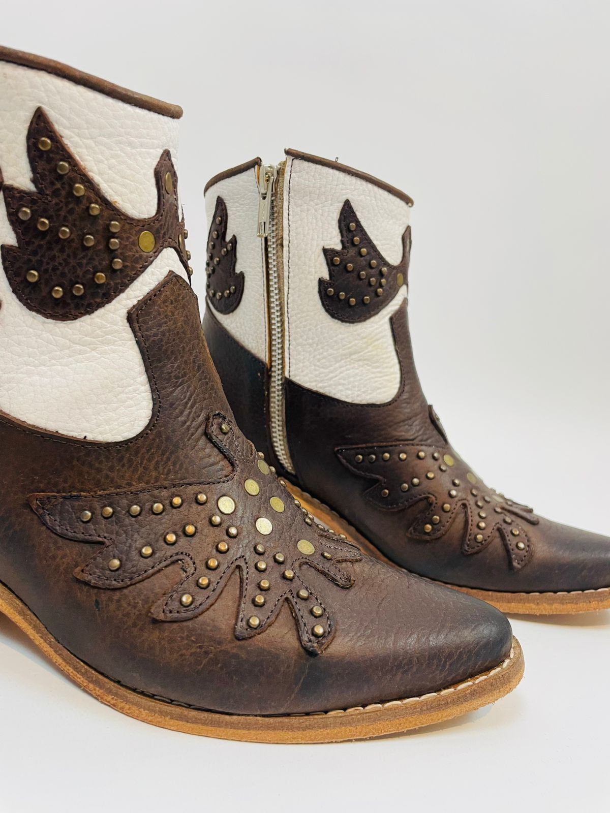 Botas 100% cuero Botas caña baja, con cierre lateral y tachas especiales en color bronce, con exclusivos diseños en bordados. Taco bajo. Color café y blanco.