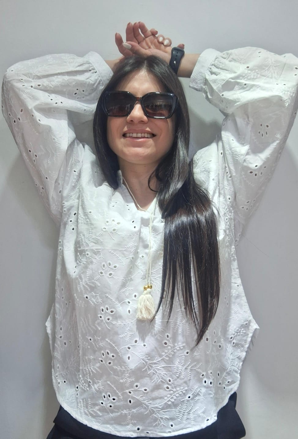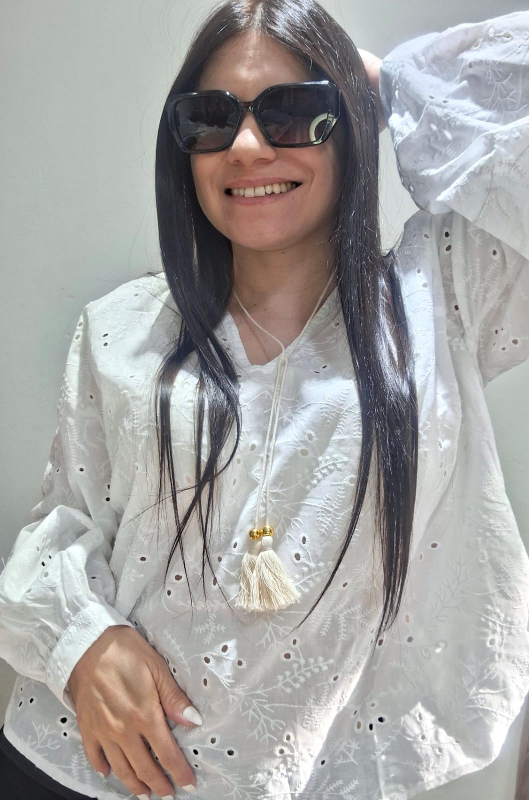 Camisa broderie blanca con lazo en el escote, super delicada para eventos especiales