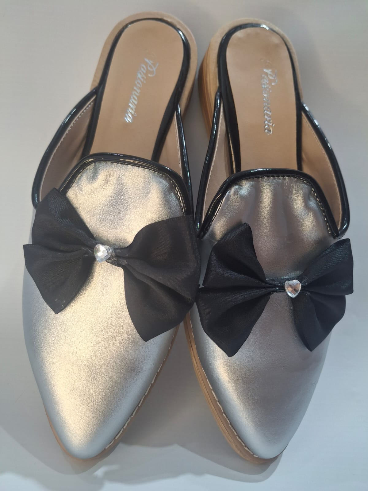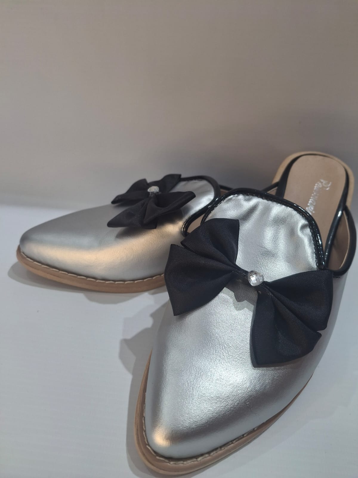 Chatitas plateadas, con un moño negro en el empeine.