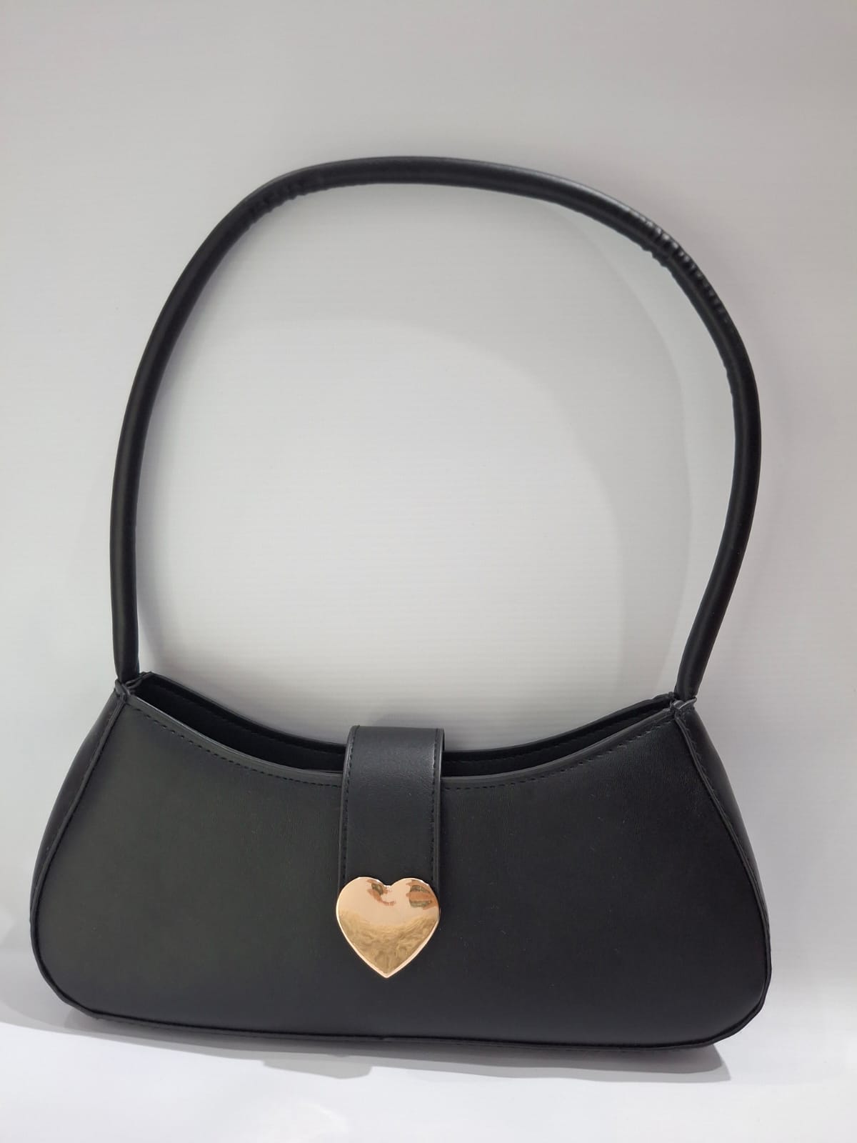 Cartera pequeña negra con forma de corazón.