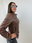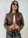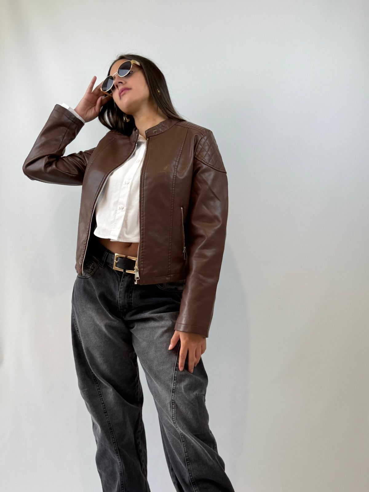 Campera ecocuero color chocolate , con broche metalico en el cuello y cierre frontal.